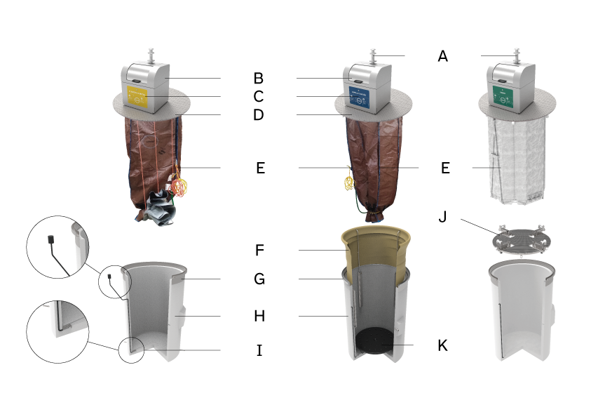 Pagaminta iš nerūdijančio plieno, su integruotomis didelių atliekų gamintojų durimis. Atliekų įmetimo anga gali būti su sukamo būgno tipo mechanizmu arba su priekinėmis atverčiamomis durimis. Pasirinktinai sukamas būgnas gali būti dvigubas, sudarant tūrinį modulį (naudojama PAYT sistemose).